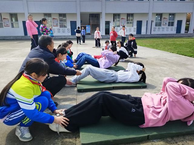 “仰卧屈膝,双手贴耳,卷腹至肘触膝,起落呼吸......”3月31日上午,在房县军店镇月明小学的体育课上,教师黄继兵手把手为学生指导仰卧起坐技巧。