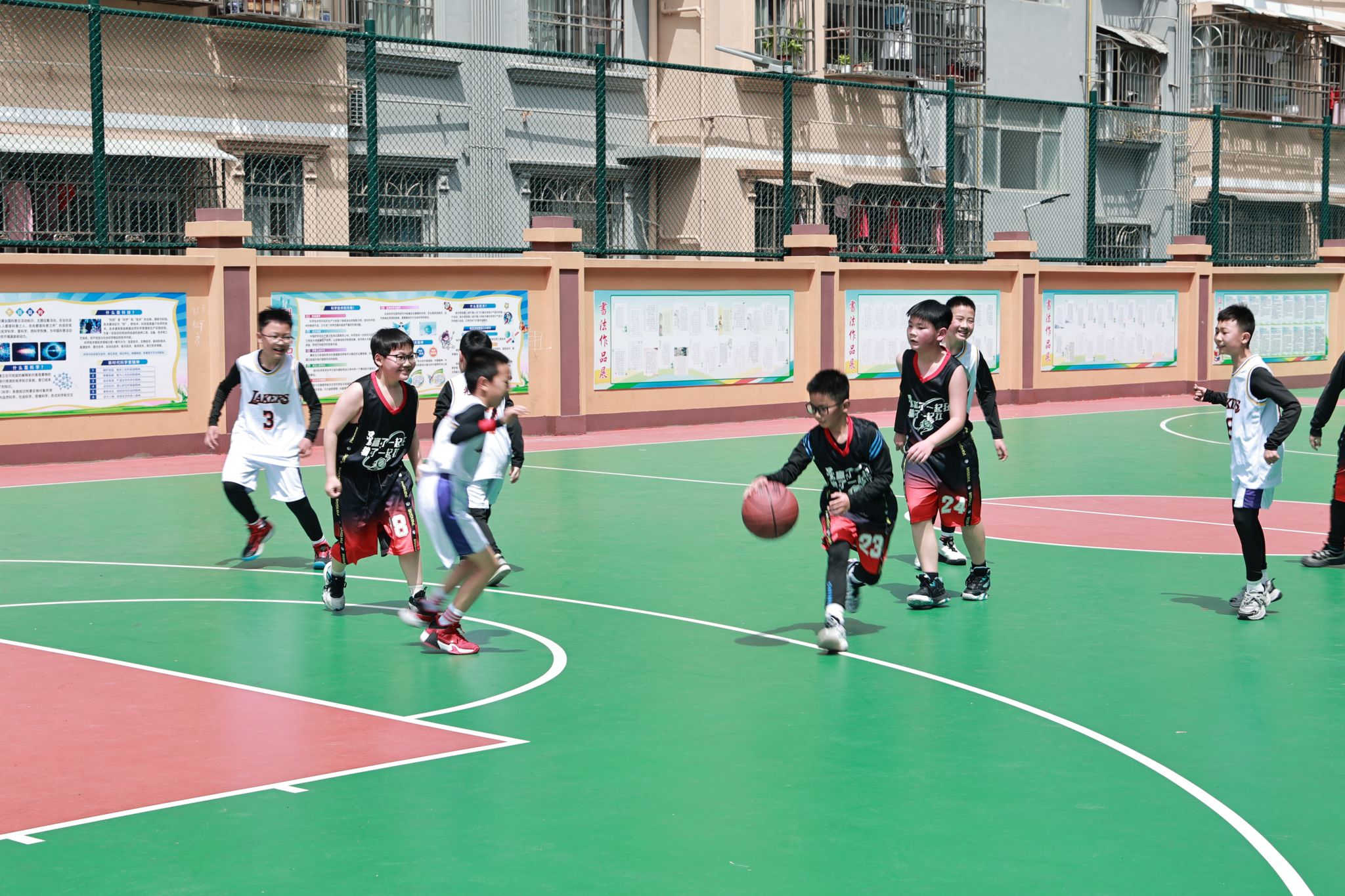 球场上,小球员们个个精神抖擞、斗志昂扬。运球、传球、突破、投篮,动作虽显稚嫩,却一招一式有模有样。五年级的比赛中,双方队员积极拼抢,比分交替上升。只见一位小球员敏捷地绕过防守,将球精准传给篮下的队友,队友接球后稳稳出手,篮球划出一道优美的弧线,应声入网,场边顿时响起热烈的掌声。