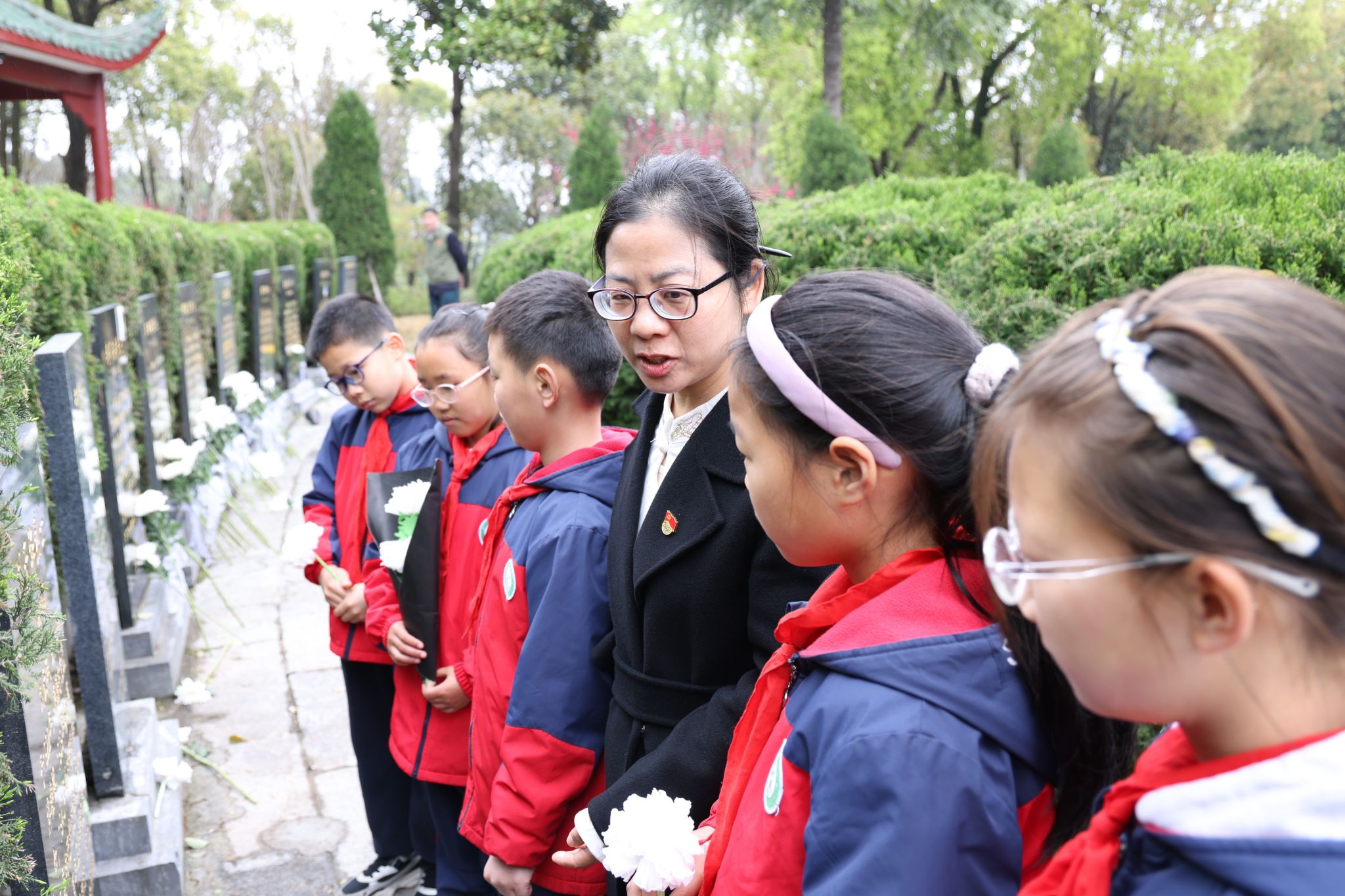 全体党员教师与少先队员代表整齐列队,在革命烈士纪念碑前肃立默哀、敬献花篮,以庄重仪式表达对先烈的深切缅怀。学校党支部书记、校长雷小华现场讲授思政课,以本地革命先烈英勇事迹为教材,从“走进历史,探寻烈士陵园红色印记”“致敬先烈,他们的选择我们的答案”“赓续精神,从缅怀到行动”三个维度阐释精神传承,勉励党员教师牢记为党育人、为国育才的初心使命,寄语少先队员听党话、跟党走,让红色精神在新时代绽放光彩。