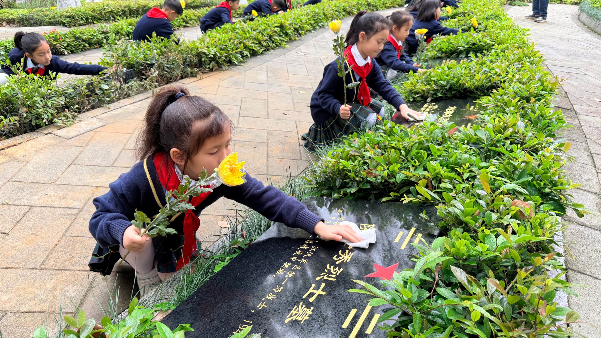 陵园内松柏苍翠、庄严肃穆,全体人员整齐列队、肃立默哀,向革命先烈致以崇高敬意。在党员教师领誓下,少先队员们高举右拳庄严宣誓,铿锵誓言回荡陵园,充分展现出新时代少年传承先烈精神、恪守清廉初心的昂扬风貌。队员们手捧鲜花,缓步敬献,以最诚挚的心意缅怀先烈;随后拿起抹布,细心擦拭烈士墓碑,在躬身实践中感悟先辈淡泊名利、清正廉洁的崇高风骨,让敬廉崇洁的理念根植于心。