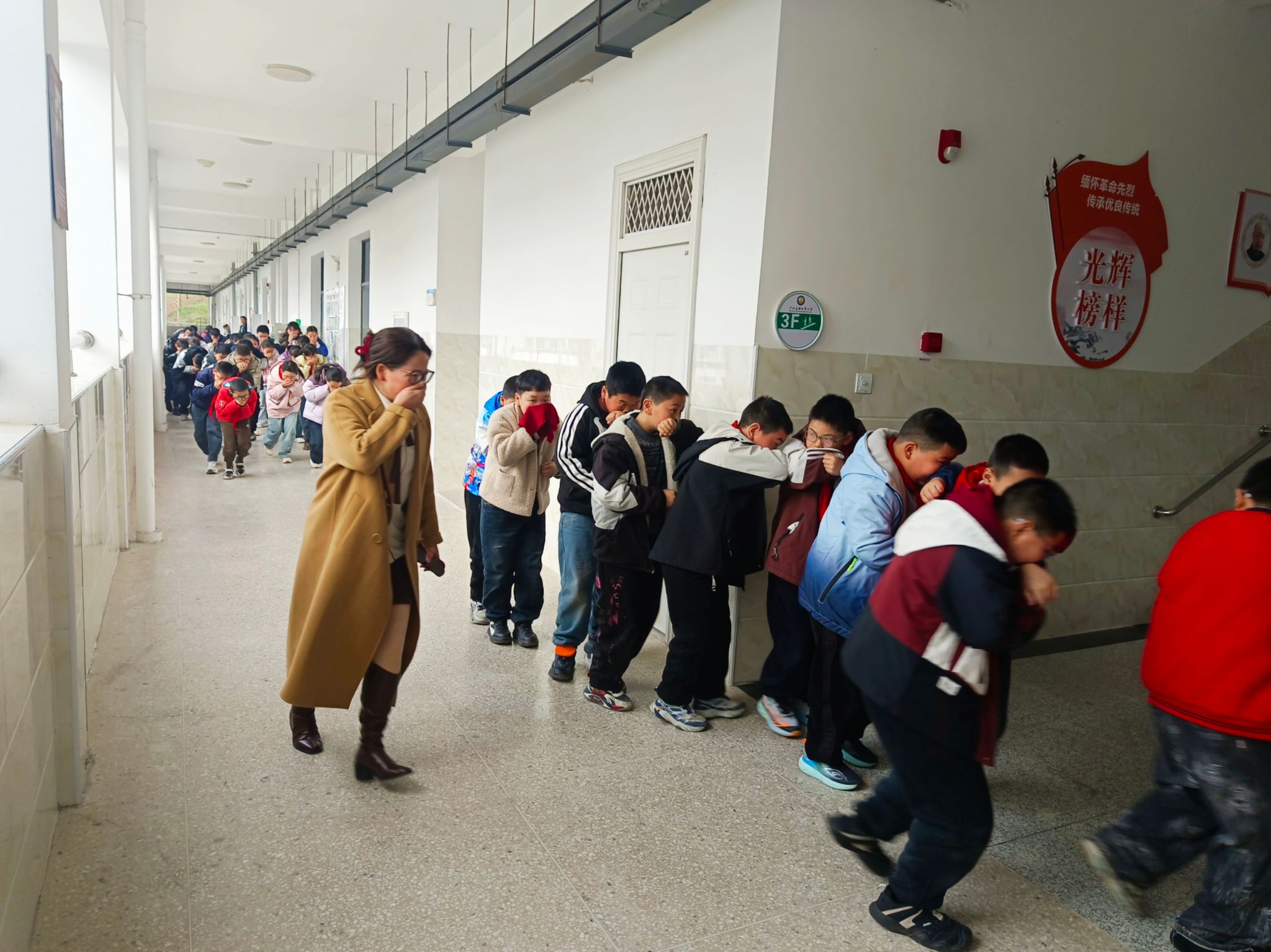 当日10点55分,急促的消防警报声在校园内骤然响起,消防应急演练正式拉开帷幕。全体师生迅速进入应急状态,同学们严格按照学校提前规划好的疏散路线,在各班老师的有序引导下,用湿毛巾捂住口鼻,弯腰低姿快速前行,整个疏散过程紧张有序、有条不紊,无拥挤、无慌乱。短短1分钟时间,全体师生便安全撤离至校园指定的空旷集合地点,各班级随即快速清点到场人数,并逐级向上汇报,确保每一位师生都安全撤离,演练初段高效完成。