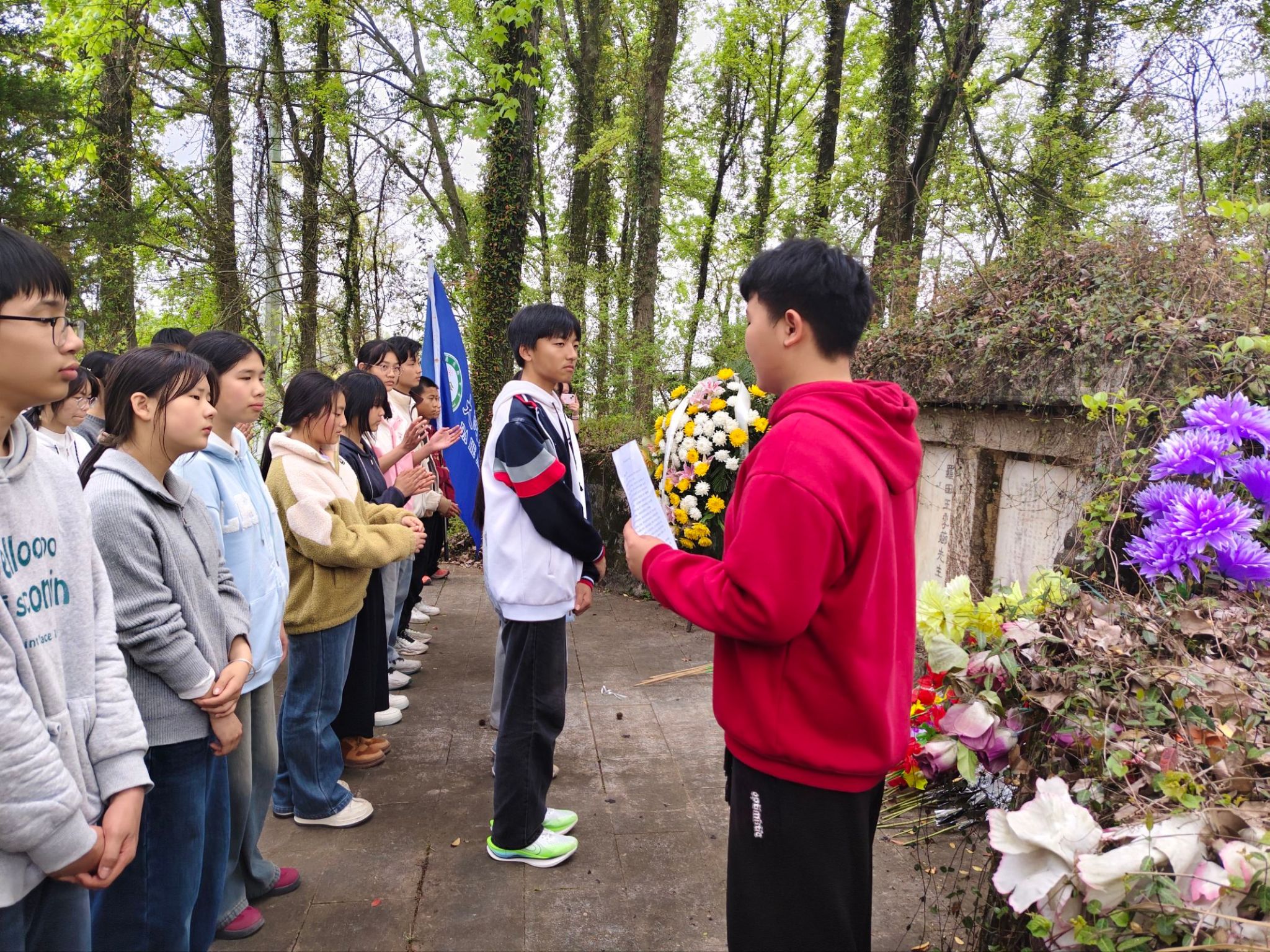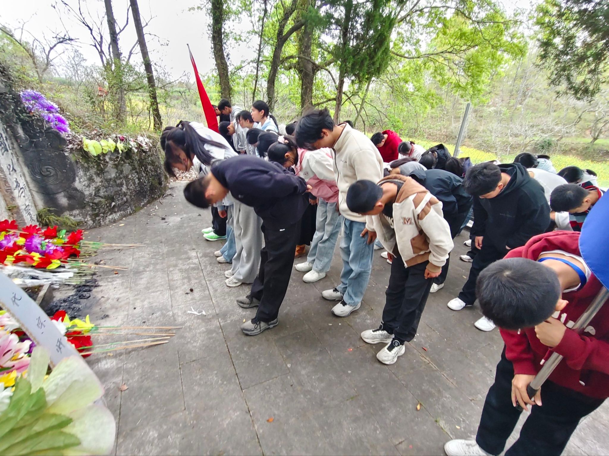 祭扫现场庄严肃穆、秩序井然。全体师生整齐列队,神情肃穆,依次向王葆心先生墓敬献鲜花、深深鞠躬、静默默哀,以最诚挚的方式缅怀先贤、寄托哀思,表达对先生一生治学、坚守气节的崇高敬意。