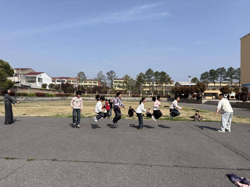 在宽阔的操场上,一场拔河比赛正激烈上演。参赛师生紧握绳索,身体后倾,拼尽全力。围观的同学们呐喊助威,加油声此起彼伏,将现场气氛推向高潮。在运动区域,同学们三三两两围在一起,下着象棋、跳棋;乒乓球台前,白球飞速穿梭,低年级学生在老师的指导下练习颠球、发球,高年级学生激烈对抗。跳绳区域,单人跳绳的学生身轻如燕,绳子在空中快速飞舞。集体跳大绳更是热闹非凡,学生们一个接一个精准地跃入翻飞的长绳中,默契配合。踢毽子的同学让羽毛毽在脚尖灵动飞舞,还有的班级在进行趣味接力跑……