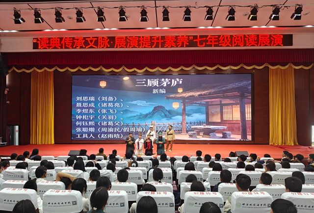 展演厅内,诗文意韵萦盈,演者意气风发。14个班级的表演者次第登堂,执课本为笺,化文辞为戏,摹先贤风骨,展诵读之姿。课本剧《三顾茅庐》见礼贤下士之怀,《刘姥姥进大观园》绘世情百态之致,《三打白骨精》显正邪明辨之智。诗词集体诵读中,《满江红》歌报国壮志,《木兰辞》咏巾帼豪情,《请党放心,强国有我》立少年鸿鹄之志,《邓稼先》颂家国奉献之心。整场表演一吟一咏皆含文气,一言一行尽释情怀,于舞台方寸之间,传经典之韵,显艺体素养,赢得师生阵阵喝彩。