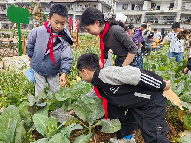活动现场,同学们化身“小小植物观察员”,在老师的引导下,认真观察基地里各类蔬菜的生长状态。大家蹲在菜畦旁,仔细辨认土豆苗、卷心菜、豌豆等作物的叶片形态、生长特点,一边观察一边认真记录,有的同学用画笔描绘植物的样子,有的同学写下自己的观察发现,在实践中学习植物生长的知识,感受生命成长的力量。