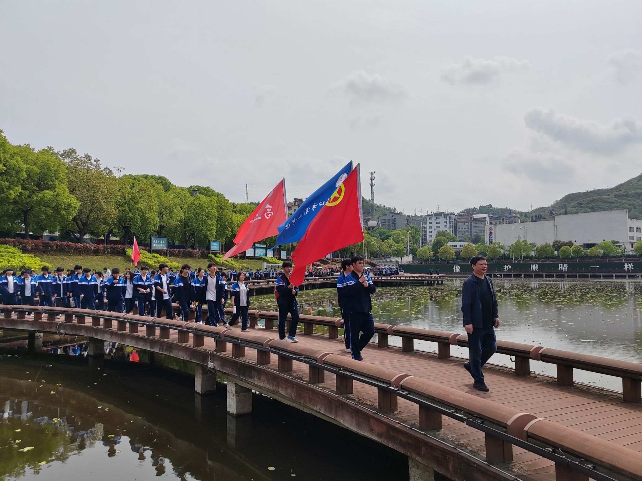四月的太极湖畔,草长莺飞,春意盎然。远足途中,校旗、团旗、班旗迎风招展,同学们精神饱满、步伐坚定,口号声与歌声此起彼伏。大家用脚步丈量前路,用汗水体悟奋斗,在自然中释放学习压力,在行进中磨炼意志。