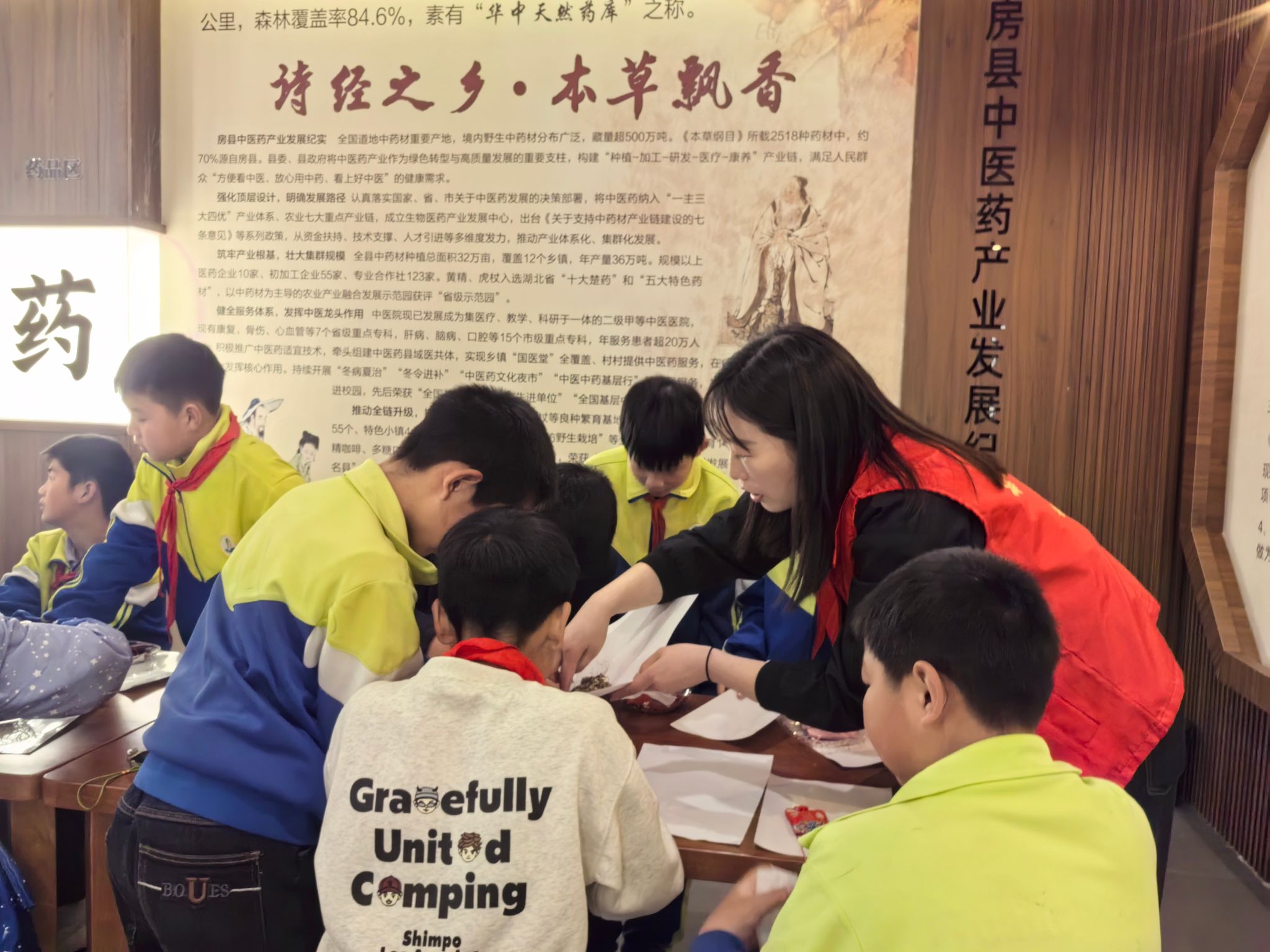 活动中,孩子们在中医药馆工作人员的带领下,有序走进场馆参观学习。工作人员结合房县本土中药材资源,向同学们细致讲解中医药发展历史,带领大家逐一认识柴胡、白及、天麻、黄精等家乡特色中药材,通过观察药材外形、辨别药材气味、讲解药材功效,让抽象的中医药知识变得生动易懂。同时,工作人员还生动讲述了扁鹊、华佗、李时珍等古代名医的传奇故事,讲述他们钻研医术、救死扶伤的医者仁心,让孩子们深刻感受中医先贤的智慧与品格,在心中埋下崇尚中医、敬仰医者的种子。