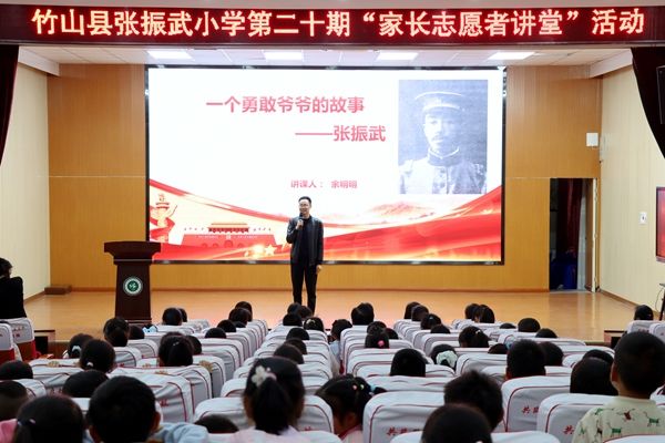 4月15日下午,竹山县张振武小学结合四月“爱国主义教育月”主题,开展第二十期“家长志愿者讲堂”。学校特邀学生家长为一年级师生讲述首义元勋张振武的革命故事,厚植红色基因,传承爱国精神。15名家长代表参加活动。