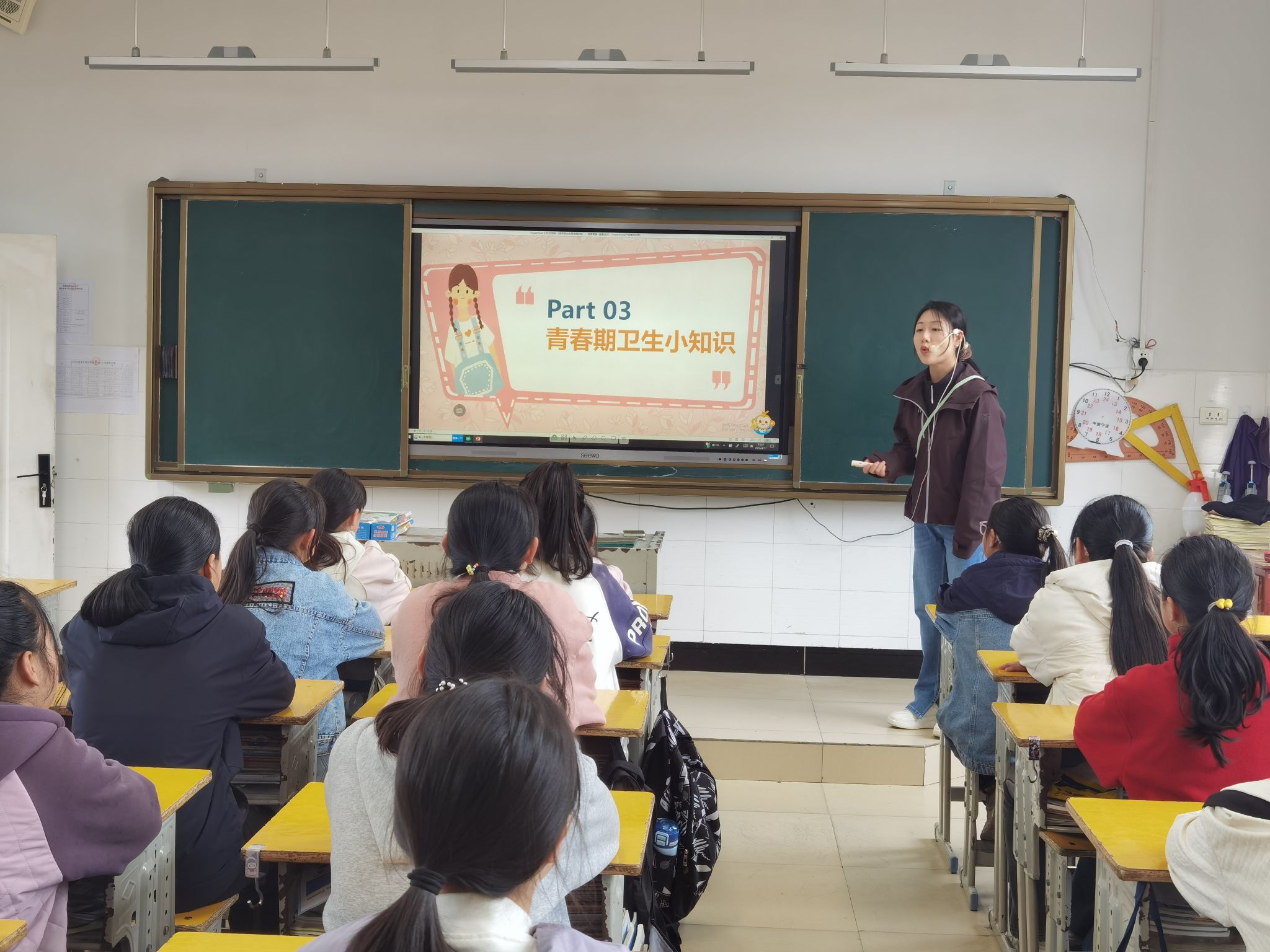 讲座以倾听、尊重、真诚、科学为课堂公约,围绕认识青春期、生理变化、卫生保健、心理调适四大板块展开系统讲解。主讲老师用通俗易懂的语言,明确青春期是儿童向成人过渡的关键时期,帮助女生清晰了解年龄阶段与成长规律。