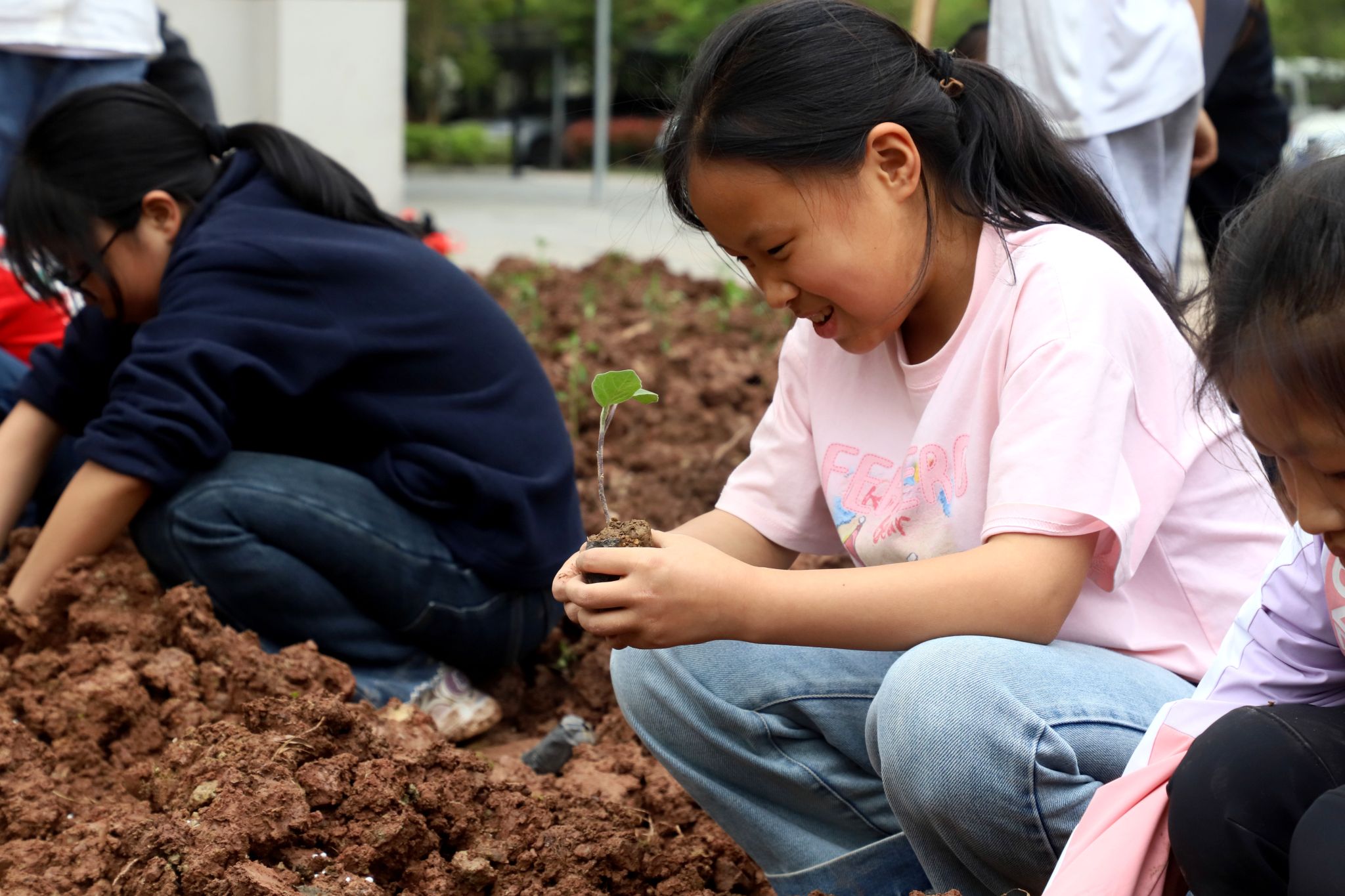 活动现场,学生们化身“小小农夫”,在老师及家长的指导下,扶苗、培土、压实......将一株株菜苗栽入泥土中。片刻之间,辣椒、番茄、黄瓜、小葱等幼苗便稳稳扎根。
