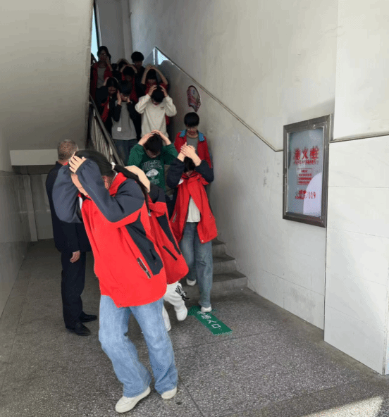 演练模拟教学楼突发火情。警报响起后,各班教师迅速组织学生用湿毛巾捂住口鼻,弯腰低姿沿预定疏散路线,快速、有序撤离至操场安全区域。各班级立即清点人数,逐级上报现场情况,整个疏散过程迅速规范,无拥挤、无滞留。