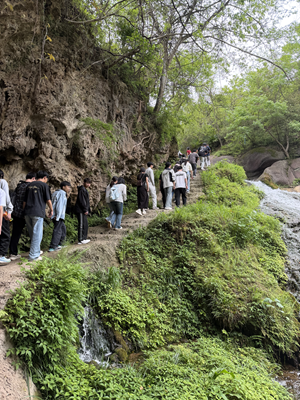 次日,同学们走进绿林山的自然课堂。在美人谷,大家沿着溪流溯源而上,观察峡谷地貌、瀑布成因与多样的动植物生态,在山水间解锁大自然的生态密码。随后的通天峡徒步中,同学们穿行于青山绿水间,感受“世外桃源”的清幽静谧,学习了喀斯特地貌的形成与演变知识。活动第三天,大家探访空山洞,近距离观察钟乳石、石笋等喀斯特景观,惊叹于大自然的鬼斧神工,更深刻理解了地质科学的奇妙。“以前只在地理课上学过喀斯特地貌,这次亲手摸到了钟乳石,听老师讲它们上百年的形成过程,一下子就懂了课本里的知识。”一位学生在研学日志中写道,“原来最好的课堂,真的在大自然里。”