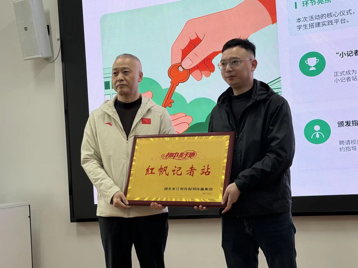 在庄重的授牌与颁奖环节,湖北长江教育报刊传媒集团为学校“小记者站”正式授牌,并颁发记者站站长聘书、特约指导教师聘书及《初中生天地》小记者证。一张张证书、一个个证件,是荣誉更是责任,标志着我校小记者工作正式启航,为同学们搭建起展示自我、表达心声的优质平台。