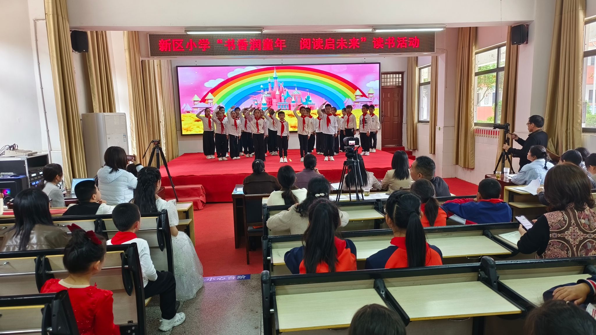 2026年4月22日,郧阳区新区小学阶梯教室内书声琅琅、气氛热烈,“书香润童年 阅读启未来”主题读书活动在此精彩上演。全校经层层筛选的学生选手齐聚一堂,通过朗诵、阅读分享、师生配音、亲子诵读等多元形式,展现阅读魅力,传递书香力量。