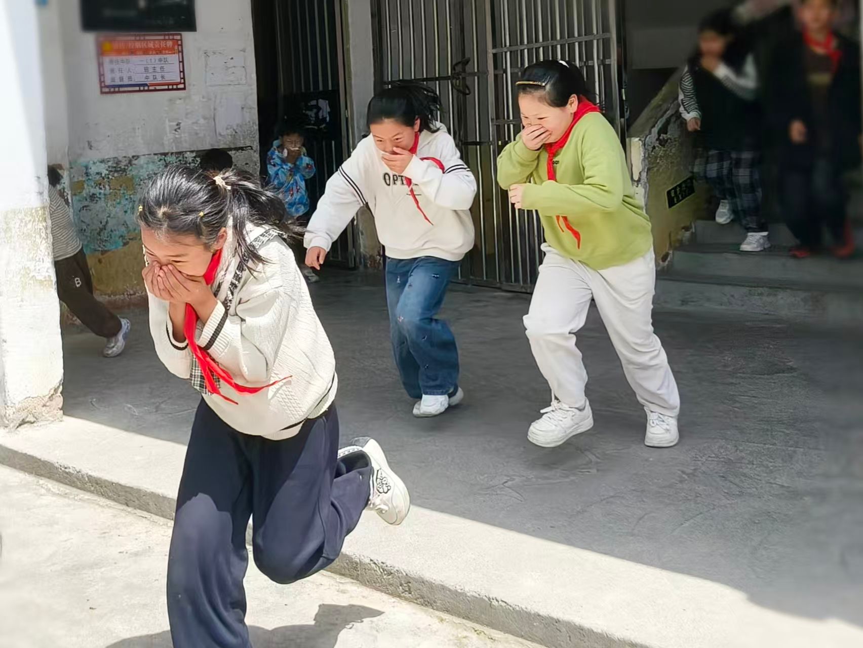 下午大课间,消防警报准时响起,演练正式启动。各班学生在任课老师的引导下立即起身、有序列队、捂住口鼻、弯腰低姿前行,全程保持安静、不推挤、不慌乱,仅用1分钟29秒,全校500余名师生按既定路线安全撤离至操场指定区域,并快速完成人数清点与上报。整个疏散过程安全有序,零失误、零延误,展现出了良好的应急反应能力。