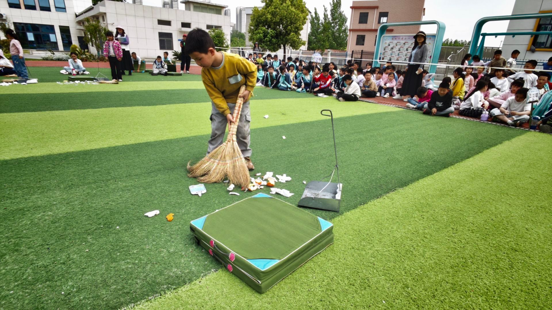 一年级的赛场里,“小大人” 们的表现格外亮眼。系鞋带环节,指尖翻飞间,鞋带便结成了整齐的蝴蝶结;整理收纳时,他们快速将书本、文具分类码放,书包瞬间变得井井有条;最后的扫地环节,小选手们握着扫帚认真清扫,连角落的碎纸都不放过,接力击掌的清脆声响里,藏着满满的默契与自信。