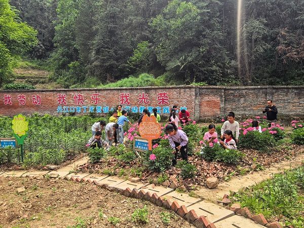 4月27日,丹江口市丁家营镇小学“百草园劳动实践基地”迎来盛春花期,芍药攒着粉艳的花苞次第绽放,满墙的金银花也垂着黄白相间的花穗,在风里漾出清甜香气。师生们利用课间时间走进基地,赴一场春日劳动之约。