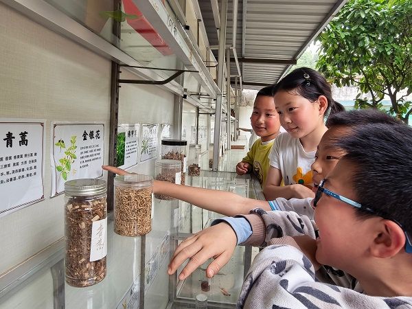 花田间满是孩子们的欢声笑语:芍药丛旁,大家围着自己去年亲手栽下的花株,兴奋地数着花瓣,闻着花香,和自己亲手种的花株合影留念;金银花架下,师生们顺着藤条小心采摘饱满的初绽花苞,指尖沾着淡淡的花香。“老师你看我摘的更多,我都等不及想马上泡茶喝!”三年级的学生捧着满满一捧花苞,语气里满是骄傲。基地一角的中草药标本展柜前也围了不少人,师生们此前采收的金银花、蒲公英、鱼腥草等本地草药都被制成标本陈列,标注着生长习性与药用价值,成为最鲜活的自然教材。