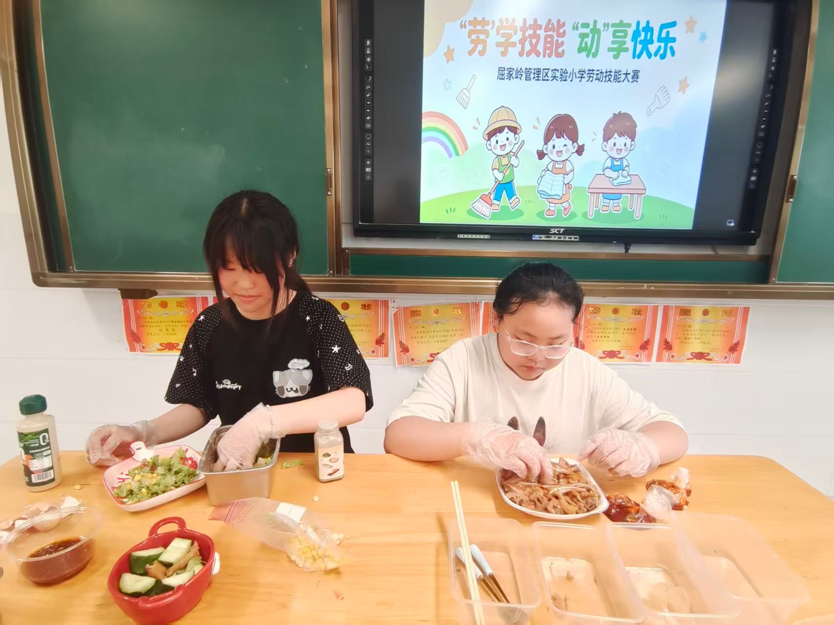 高年级赛场精彩纷呈,五年级学生穿针引线、手法沉稳,缝制出针脚细密、结实耐用的布艺沙包;六年级学子配合默契,凭借精心准备的食材与器具,制作出摆盘精致、清爽可口的特色凉菜,每一份作品都展现着扎实的劳动技能。