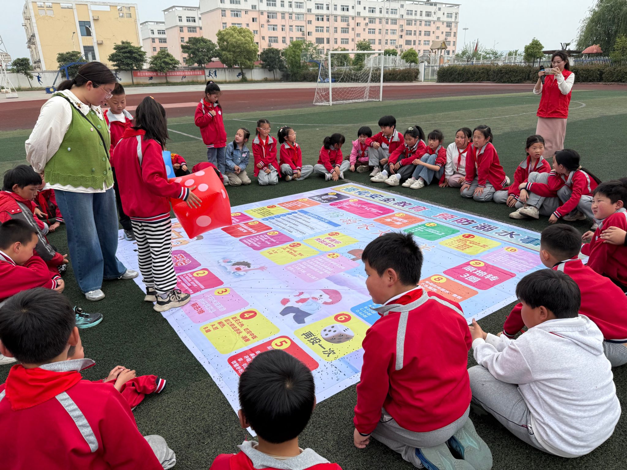 游园互动闯关,在趣味中牢记安全。最受同学们欢迎的,是防溺水游园游戏与绘画涂色环节。操场上,巨大的防溺水飞行棋铺在草坪上,同学们轮流投掷巨型骰子,在闯关游戏中抢答安全知识;教室内,防溺水长卷涂色活动同步开展,同学们拿起画笔,用五彩颜料勾勒防溺水标语、绘制安全场景,在创作中加深对安全知识的理解。完成游戏和涂色的同学们,还获得了“文明安全小卫士”专属小奖品,成就感满满。