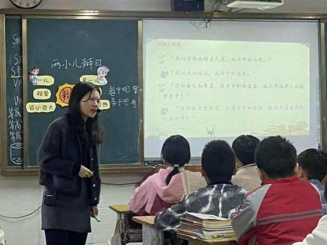 语文组围绕《两小儿辩日》《田忌赛马》《自相矛盾》等经典篇目展开同课异构。在《两小儿辩日》教学中,吕红艳、朱丽丽、吴慧敏、李圣炬四位老师各展所长:或从诵读入手,在抑扬顿挫中感悟辩斗之趣;或创设情境,让学生化身“两小儿”现场辩论;或引入科学视角,打通文理壁垒。同一篇文言文,在不同教师的演绎下,生发出思辨、审美与文化的多重韵味。曾玲玲老师执教《田忌赛马》,在策略分析中训练逻辑思维;黄秀娟老师执教《自相矛盾》,通过情景剧表演深化寓言理解,让语文课堂既有情趣又有理趣。