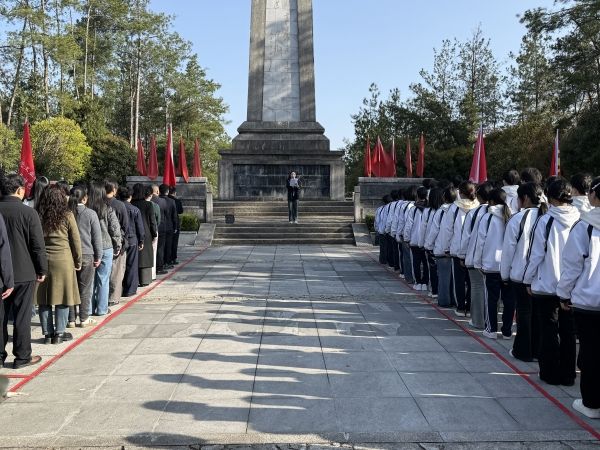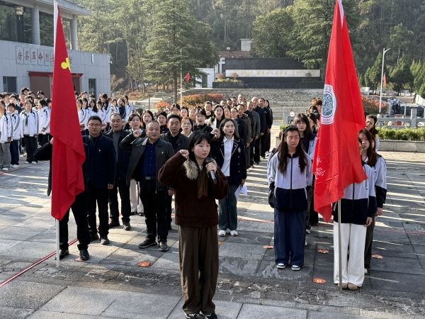 仪式上,学校党总支部宣传委员曾兴发回顾了革命先烈的英勇事迹,强调传承革命精神的重要性,勉励学子勤学苦练、报效祖国;团员代表谭月潇发言,表达了继承先烈遗志、奋发向上的坚定决心。随后,全体党员教师面向党旗重温入党誓词,全体团员面向团旗重温入团誓词,铿锵誓言回荡在陵园上空。学校党支部副书记、副校长望家龙为师生讲授团课,引导大家铭记历史、勇担使命。仪式最后,全体人员在纪念碑前集体合影,定格这一庄严时刻。