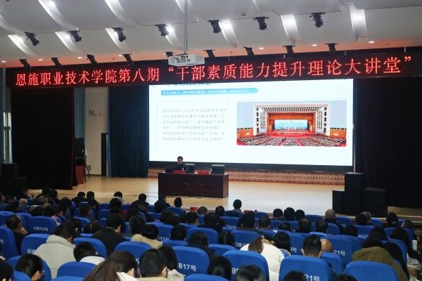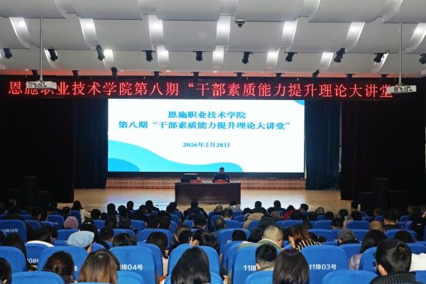 2月26日,恩施职业技术学院举办第八期“干部素质能力提升理论大讲堂”,以“职教出海拓新路,警校联动筑平安”为主题开展专题学习与培训。该校党委副书记、院长向定山主持活动并讲话,全体在家校领导、中层干部、教师代表及安保人员共350余人参加。