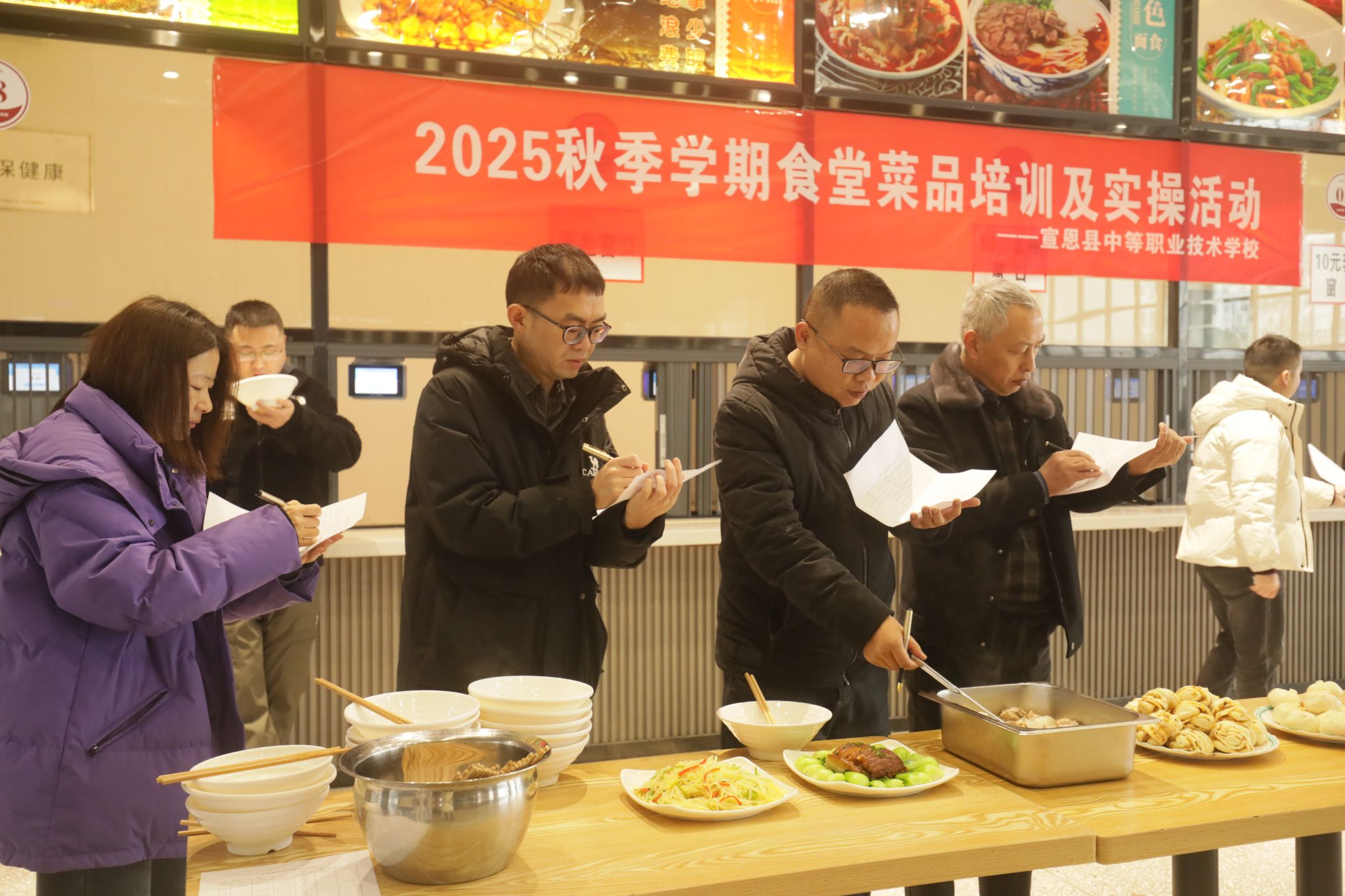 12月27日上午,宣恩县实验高中(宣恩职校)一楼食堂内香气氤氲、热闹非凡。为检验厨师技能水平,规范菜品制作流程,为学校餐饮服务提供品质保障,同时促进厨师间交流学习,推动餐饮团队整体提升,学校开展了菜品测评及实操活动。活动伊始,食堂师傅们在后勤管理团队的带领下,开展了练兵活动。他们各显身手,亮出绝招,娴熟的刀工、合理的搭配,展示自己的制作和烹饪技能。品鉴现场,数十道特色菜品依次亮相,色、香、味、形、意兼具,...