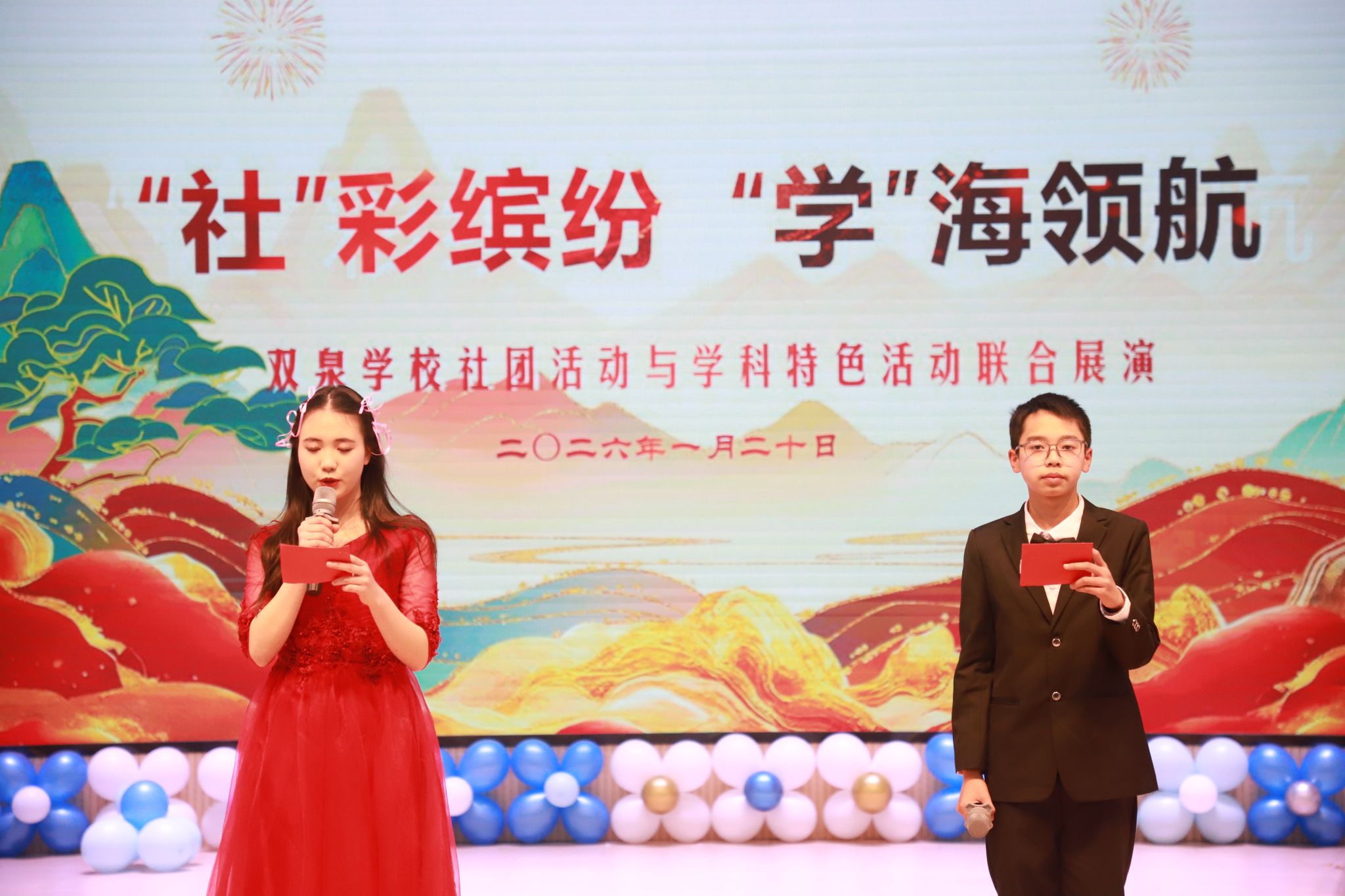 双泉学校初中部“社彩缤纷,学海领航”社团活动与学科特色活动联合展演于1.21日在学校报告厅温情启幕。学校领导、家长代表与全体师生齐聚一堂,共同见证这场融合学科素养与青春活力、交织传统底蕴与科创锋芒的教育盛宴,让素质教育的成果在舞台上绽放出最耀眼的光芒。